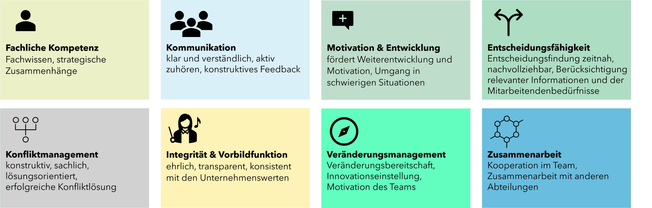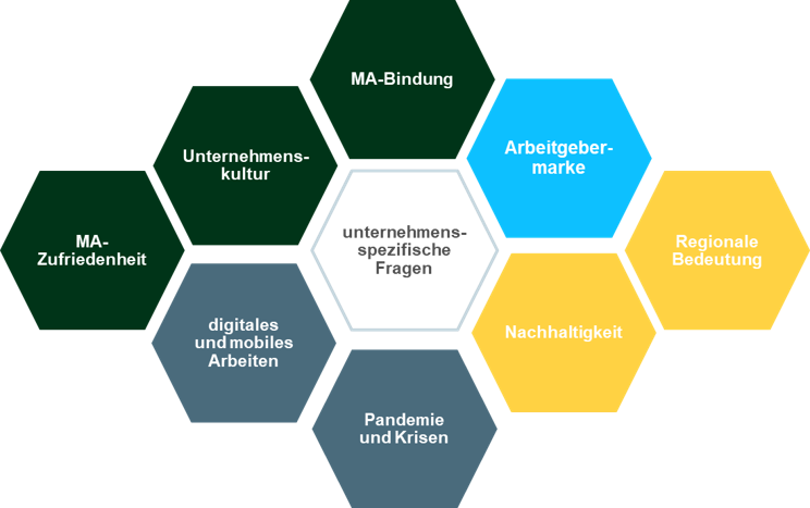 Mitarbeitendenbefragungen können mit folgenden Themenschwerpunkten ausgestaltet werden: