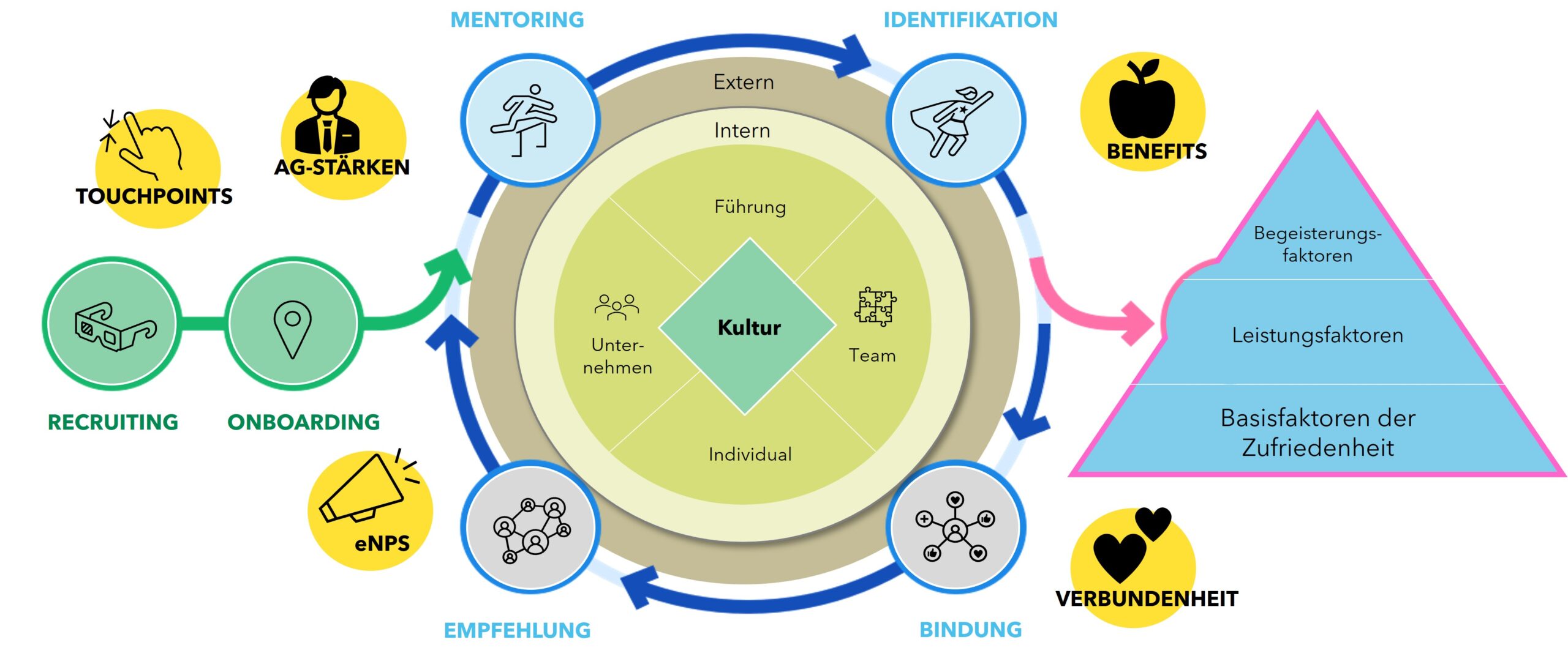 Entlang der Employee Journey – von Recruiting und Onboarding über Mentoring und Identifikation bis hin zu Bindung und Weiterempfehlung – werden entscheidende Einflussfaktoren sichtbar. Diese reichen von Basisfaktoren der Zufriedenheit bis zu Begeisterungsfaktoren, die emotionale Verbundenheit fördern.