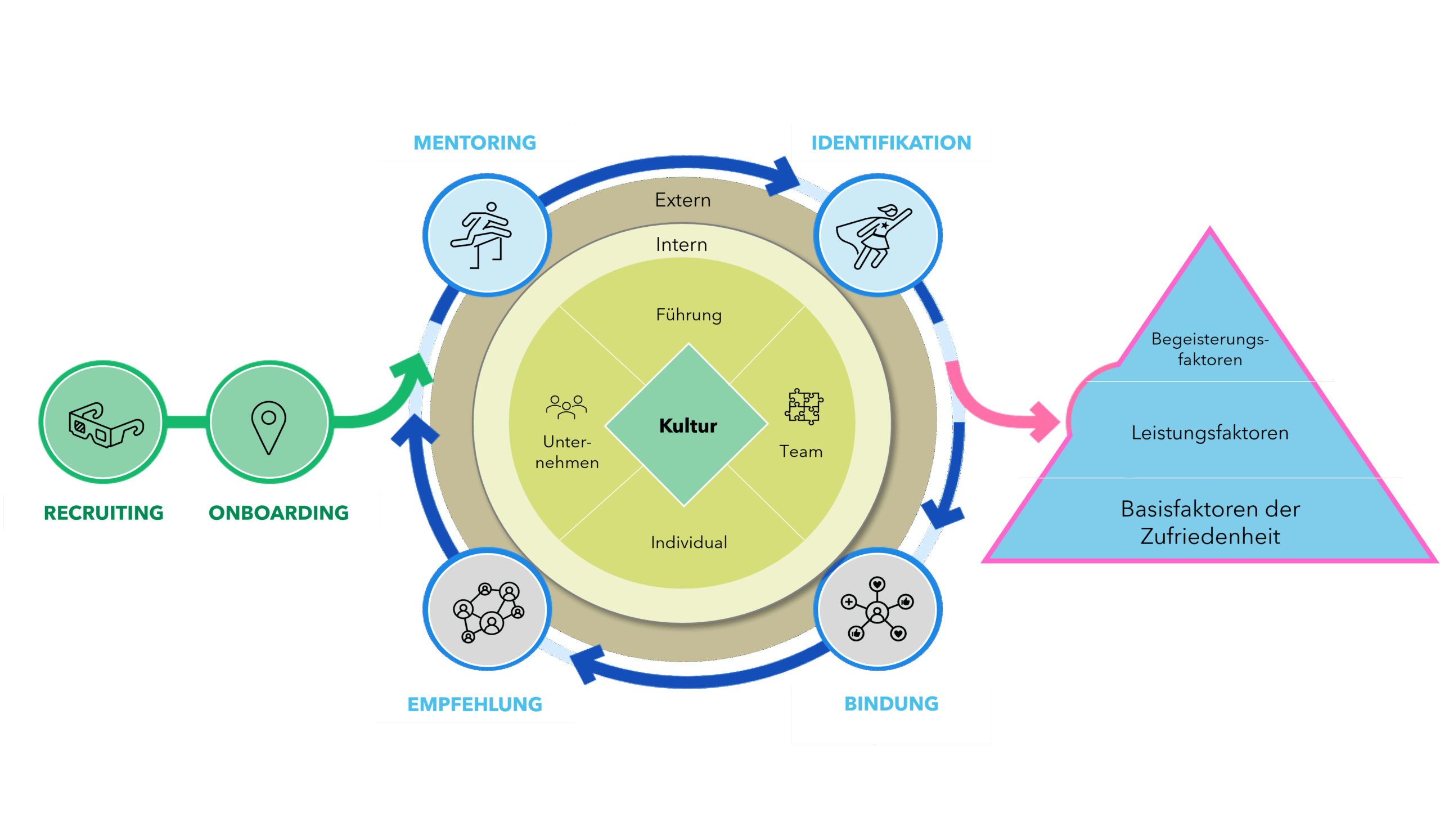 Entlang der Employee Journey – von Recruiting und Onboarding über Mentoring und Identifikation bis hin zu Bindung und Weiterempfehlung – werden entscheidende Einflussfaktoren sichtbar. Diese reichen von Basisfaktoren der Zufriedenheit bis zu Begeisterungsfaktoren, die emotionale Verbundenheit fördern.