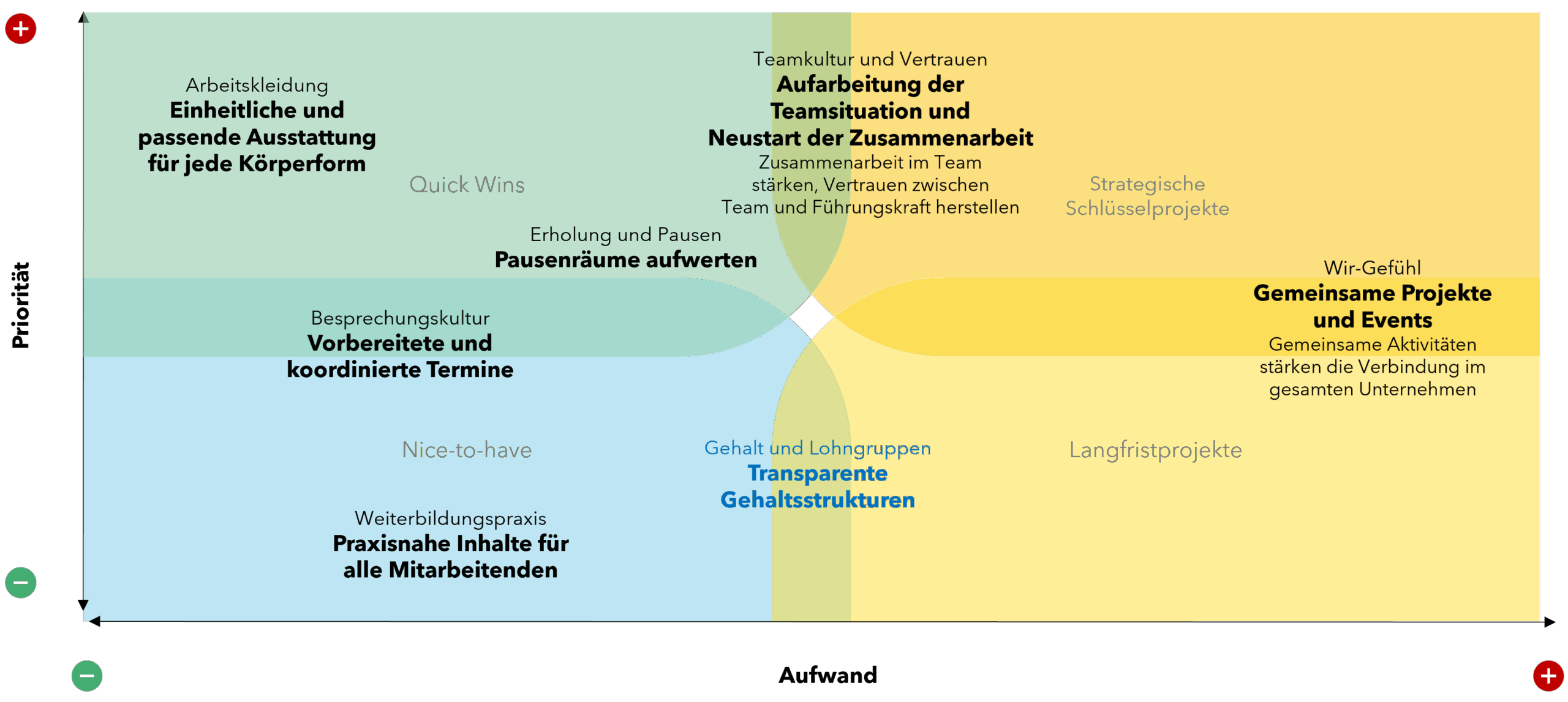 Im Feld der Quick Wins finden sich Themen mit hoher Bedeutung und geringem Aufwand, etwa die Aufwertung von Pausenräumen, besser vorbereitete Besprechungen oder eine einheitliche Arbeitskleidung. Diese Maßnahmen lassen sich kurzfristig realisieren und zeigen schnell positive Wirkung auf Zufriedenheit und Arbeitsklima.