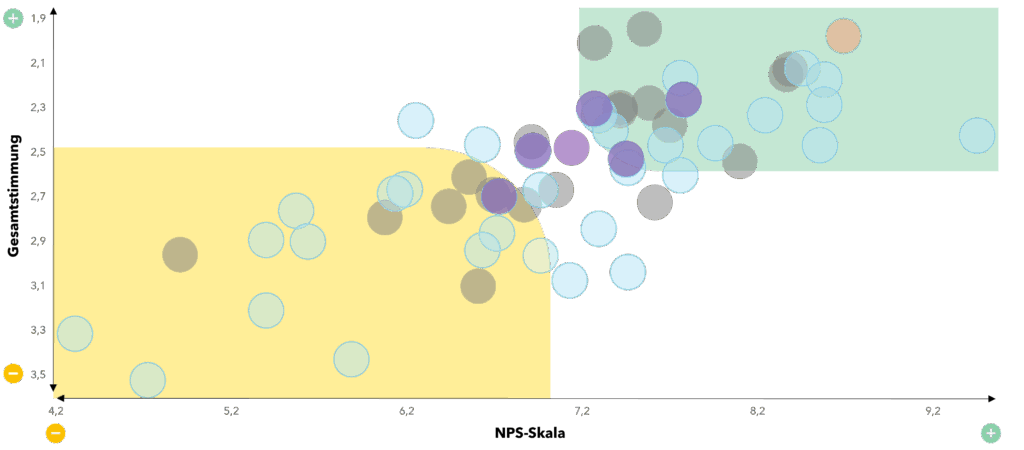 Diese Grafik stellt die Ergebnisse einer quantitativen Mitarbeitendenbefragung in Form einer Stimmungs- und Weiterempfehlungsmatrix dar. Sie verknüpft zwei zentrale Dimensionen: